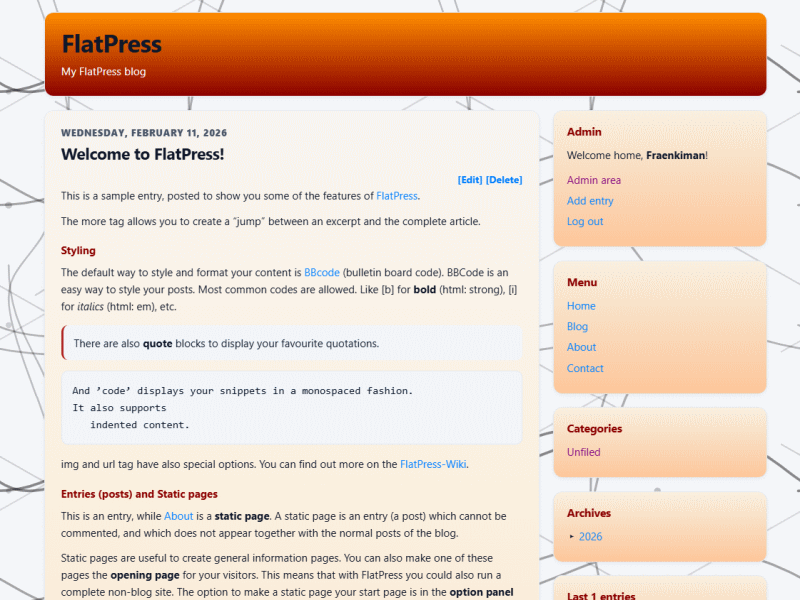 - Menü (Der Inhalt dieser statischen Seite taucht auch in der Seitenleiste deines Blogs auf - das ist die Magie des Blockparser-Widgets. Das FlatPress-Wiki hat Informationen dazu, und noch viel mehr!)